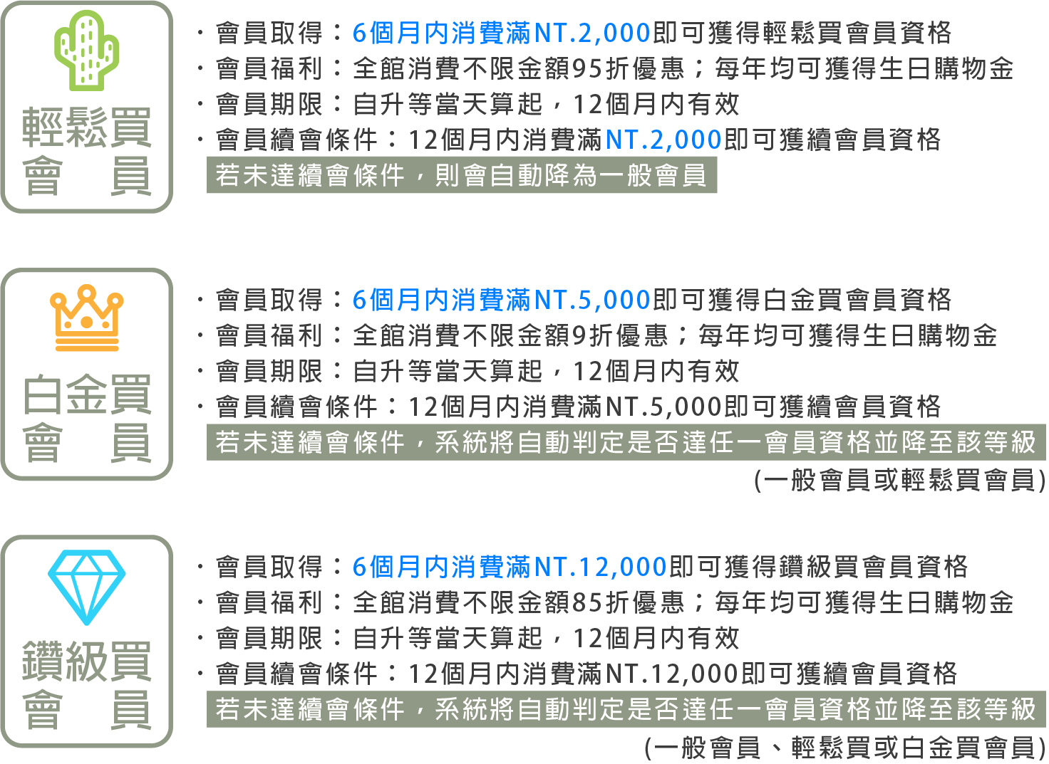 ˙會員升級以6個月為基準,在消費後6個月內累積消費金額滿額即可享有升級或續會資格