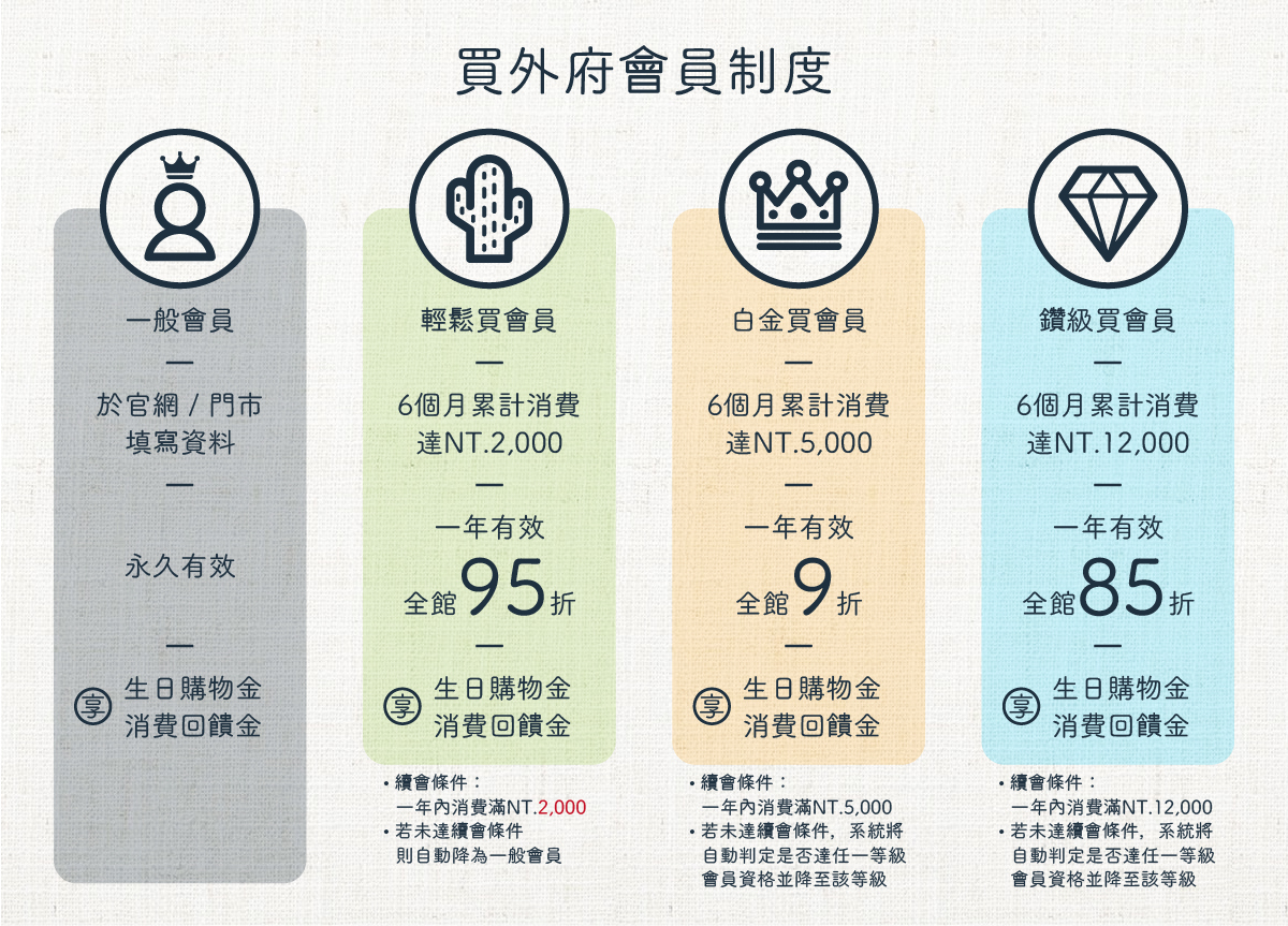 ˙買外府目前提供一般會員與三種會員級別身份