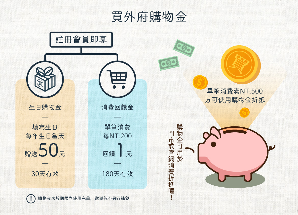 買外府提供「生日購物金」與「消費回饋金」兩種優惠回饋
